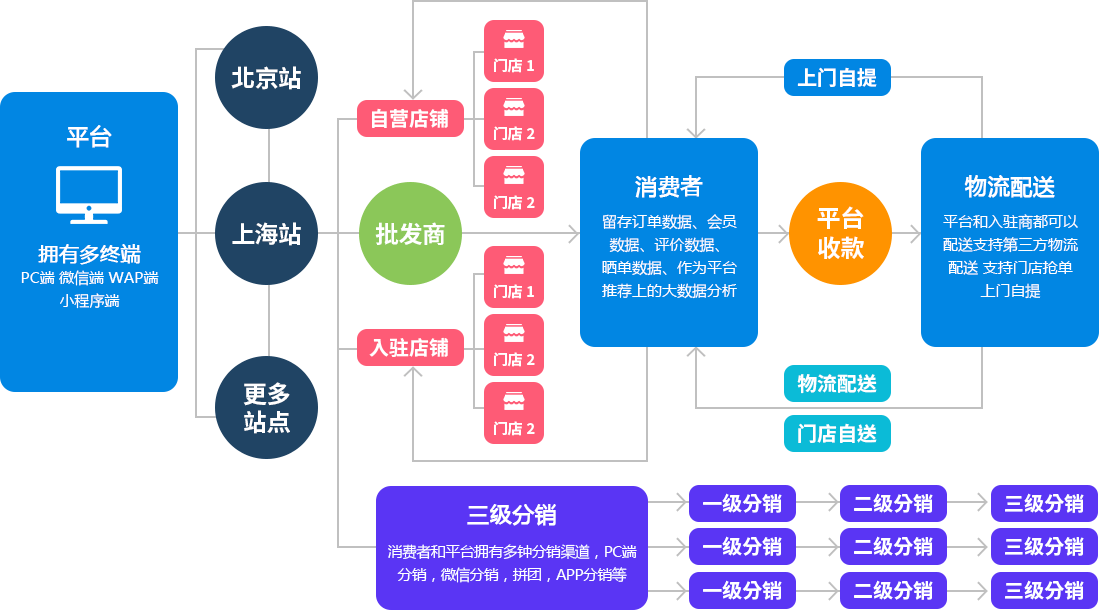 SuteShop多商户商城平台系统结合“入驻—供货—采购—分销”的四位一体思路,从平台到站点到供货商供货,从商家入驻到网点区域配送,再到终端顾客,形成一个完整的电商生态模式。