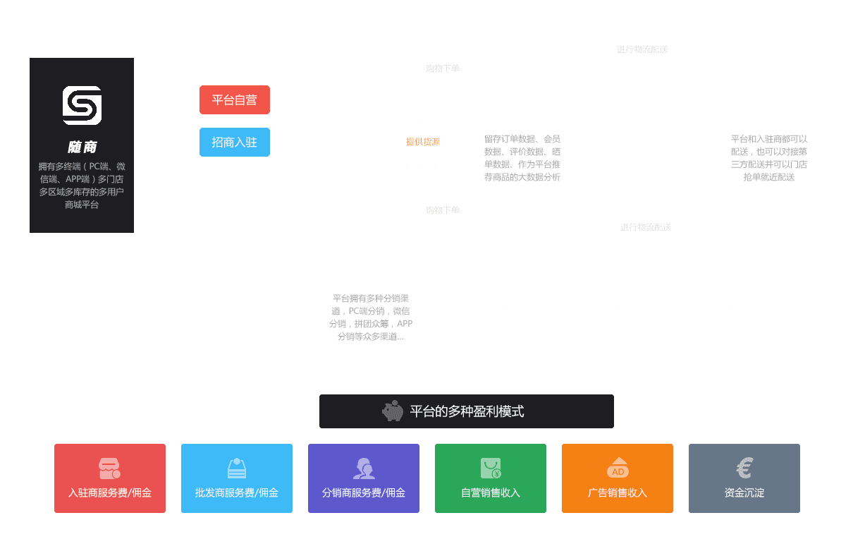 随商系列产品商城系统平台是随商历时多年,倾力打造的b2b2c模式电商平台系统,统全面支持多用户商城系统、b2b2c商城系统、微信商城系统、多店商城系统、手机商城系统等等,兼容b2c&b2b2c&o2o&b2b等各种运营模式,自营 招商 批发 供货 分销 城市分站 区域代理 混合连锁o2o门店,打造线上线下一体化电商生态圈。